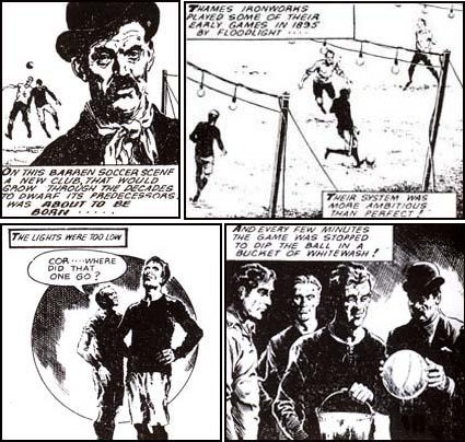 But, more than 50 years before this date Woolwich Arsenal’s reserves took part in a game under “electric light” at Canning Town where they played the newly formed Thames Ironworks. The date was 16 March 1896. The cutting below from the Evening Standard in 1960 gives an idea of how the lights were arranged. It looks like there were one or two impracticalities associated with the arrangement. Not least the fact that the lights, according to Arsenal director George Lawrance, had a tendency to fail when Arsenal came close to scoring.